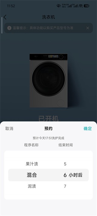 4、洗衣机:控制开机与预约:点击洗衣机图标开机 → 选择 “预约” → 选择洗涤程序即可