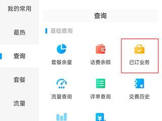 1、登录中国移动app,点击分类,点击查询,点击已订业务。