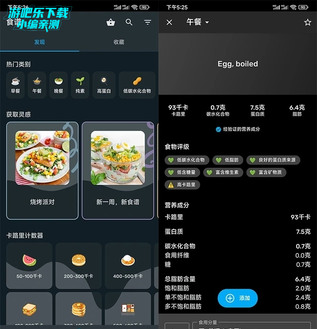 内置了超过 130 万种食物的营养成分数据,涵盖了主流的快餐、饮料、烘焙甜点、进口食品等。用户可以通过搜索或扫描条形码快速查找食物,查看其含量详细的营养成分数据,包括热量、碳水化合物、蛋白质、脂肪、维生素等。