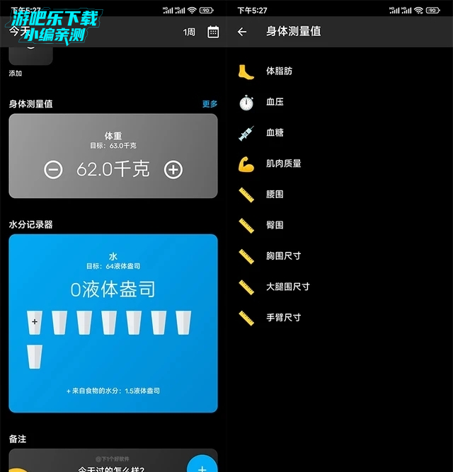 其它功能方面,还提供了水分摄入监控、身体测量值、体脂肪测量、血压、血糖、肌肉质量、腰围、胸围、手臂、大腿围尺寸等等。