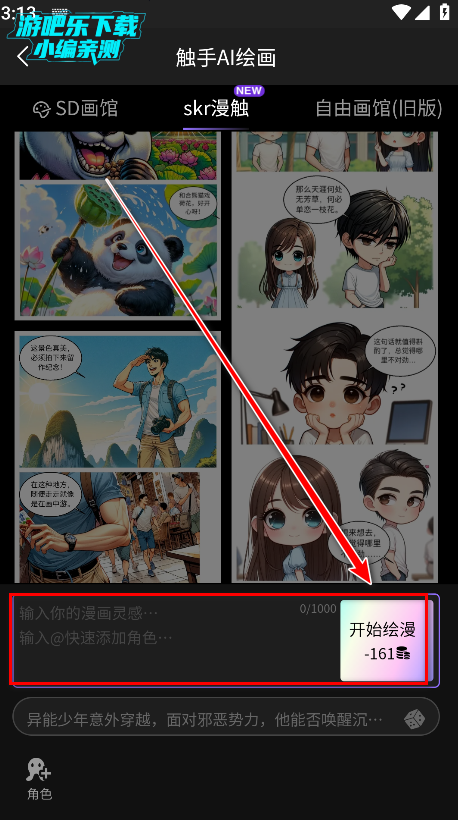 2.在方框内输入灵感关键词,点击开始绘漫。耐心等待软件生成即可。