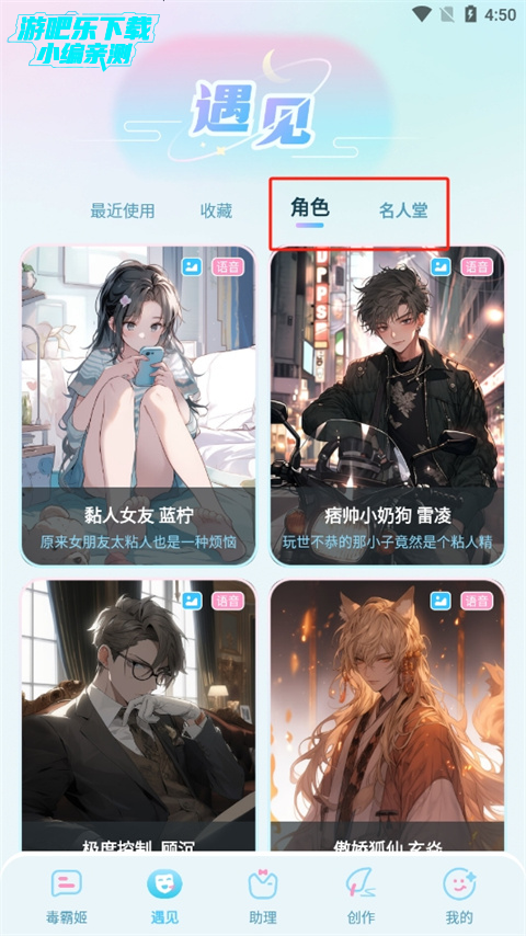 2、点击角色或者名人堂即可选择AI角色来进行聊天;