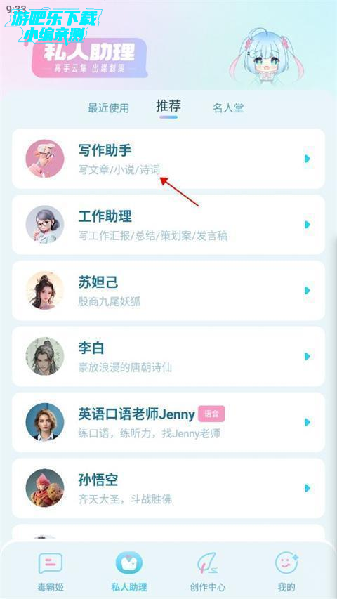 2、在私人助理界面点击写作助手可以帮助我们进行文学创作。