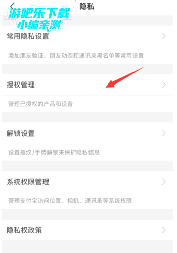 3、在隐私设置栏内选择第二个“授权管理”,在里面会有该支付宝账号下授权绑定过的全部应用。