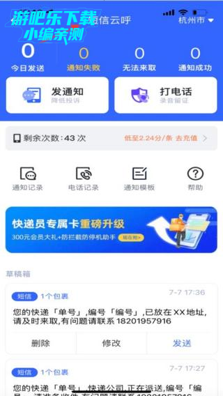 3、点击短信云呼页面,可发通知、打电话,显示剩余次数等信息,还有通知记录、模板等实用功能。