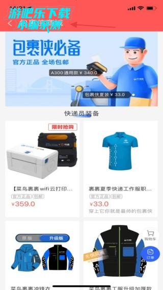 2、点击包裹侠商城内,提供快递员必备装备,官方正品且包邮,有打印机、工作服等商品可选。