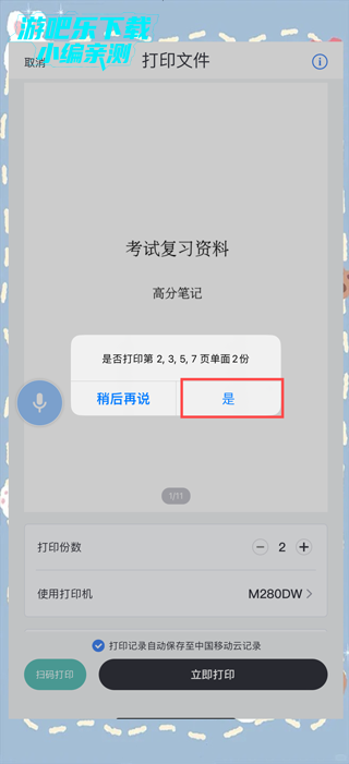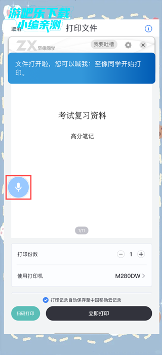 2、在打印页面,只需长按麦克风按钮,然后清晰地说出指令:“至像同学,请打印第2页、第3页、第5页以及第7页,并打印两份。”这样,你就能轻松地完成复杂的打印任务,无需繁琐的操作。