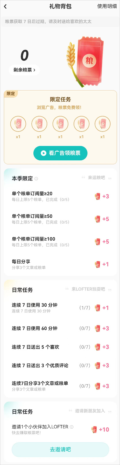 单个粮单订阅量≥20(每日上限5个粮单),获得免费礼物,每日数量:3