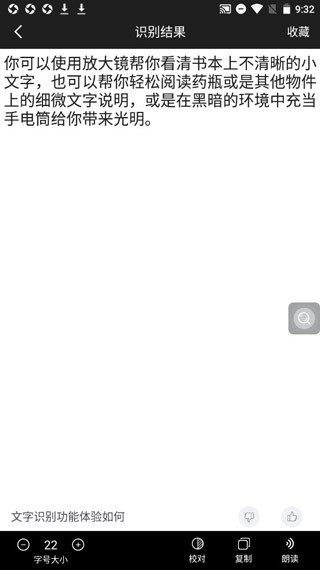 如果你需要放大文字,可以在app中找到“放大文字”或“文字识别”功能。