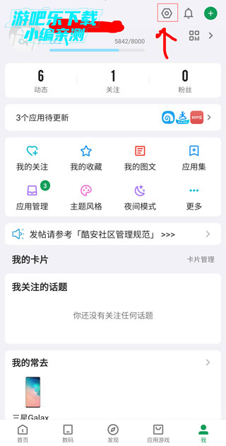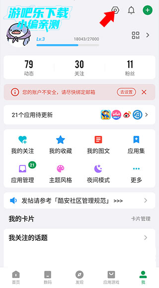 1、打开酷安app,点击我的,注册或登录账号后,点击右上角的设置;