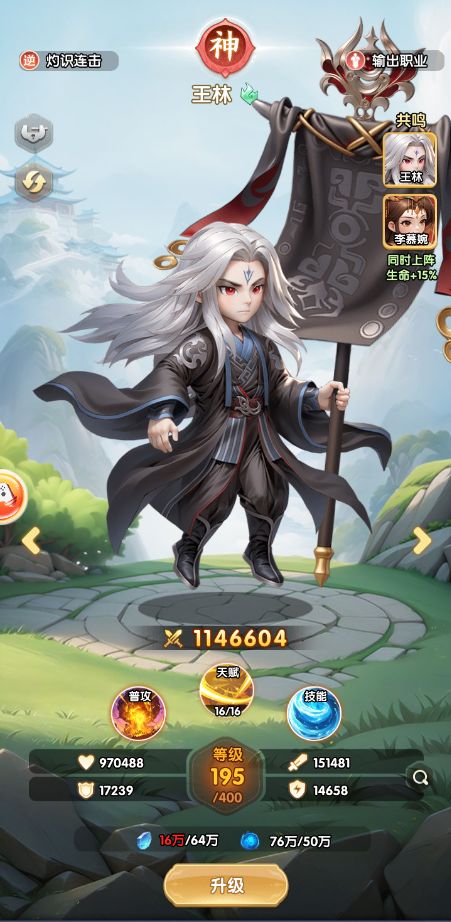 王林的队友搭配,以+攻击+防护为主,中前期以【王林+李慕婉+端木极+红蝶+其他随意】为主,李慕婉给王林羁绊加攻,端木极给加盾,红蝶群控,前2回合无敌,有这两回合的保护,王林基本能把输出拉满。
