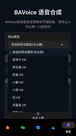8、资源导入进来后就可以进行语音合成等操作,比如选择预设模型等,操作后就可以导出新的学生语音资源,导出时以"/学生/翻译.文件格式"导出到手机根目录"/BAVoice/"上