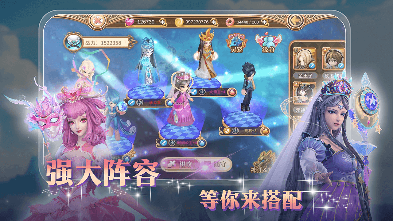界面左上角显示阵容战力,右上角可点击进入【灵宠】、【缘分】界面。