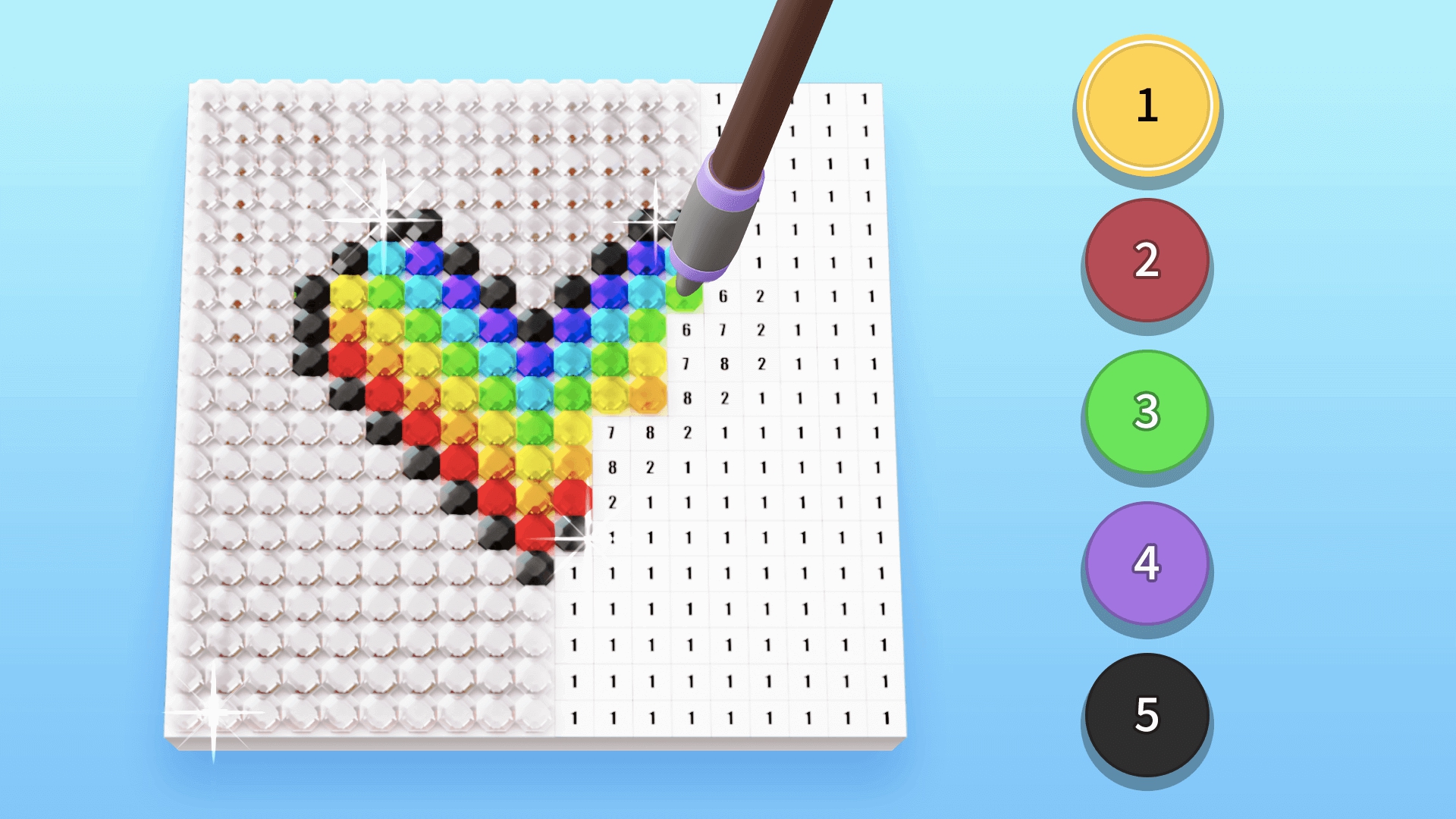 1、先打开游戏里的涂色页面,瞅准每个小方格上的数字,旁边有对应数字的彩色块,直接点彩色块再点方格就行,不用费脑子想!
