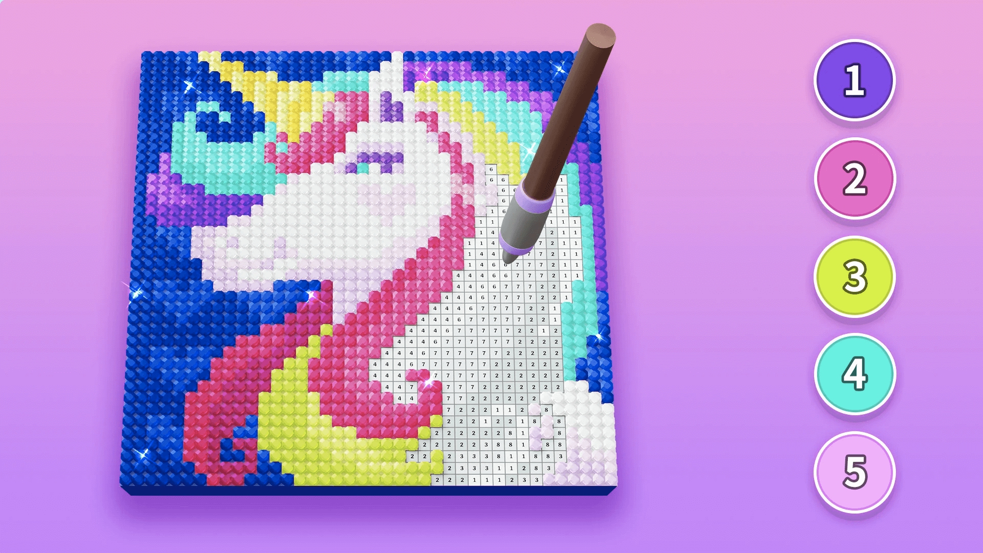 体验数字油画游戏不需要动什么脑筋,玩家只需按照要求,将每个数字对应的颜色填入小格子,将所有的格子填满之后,你就会得到一个好看的画!主打的就是放松,没有乱七八糟的任务,完成当前的作品之后,想继续玩的话,可以随机抽取一个新的图画去填色!
