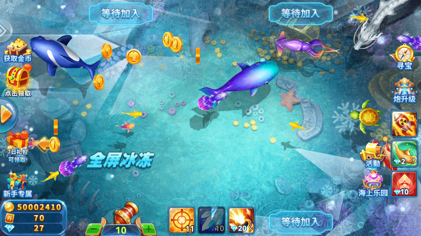 3、调节炮倍、锁定大鱼、冰冻、狂暴、分身,各种技能助您轻松打BOSS!